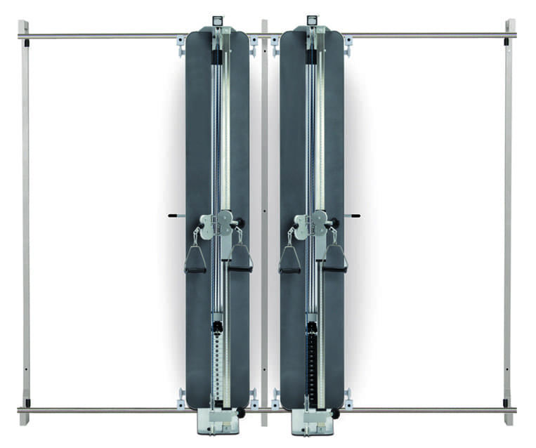 Praktische Vorrichtung, mit der die Zugapparate bequem verschoben werden können, um sie nach Bedarf zu platzieren oder zusätzlichen Platz zu schaffen. Zur besseren Veranschaulichung beinhaltet die Abbildung 2 Zugapparate, die im Lieferumfang nicht enthalten sind.