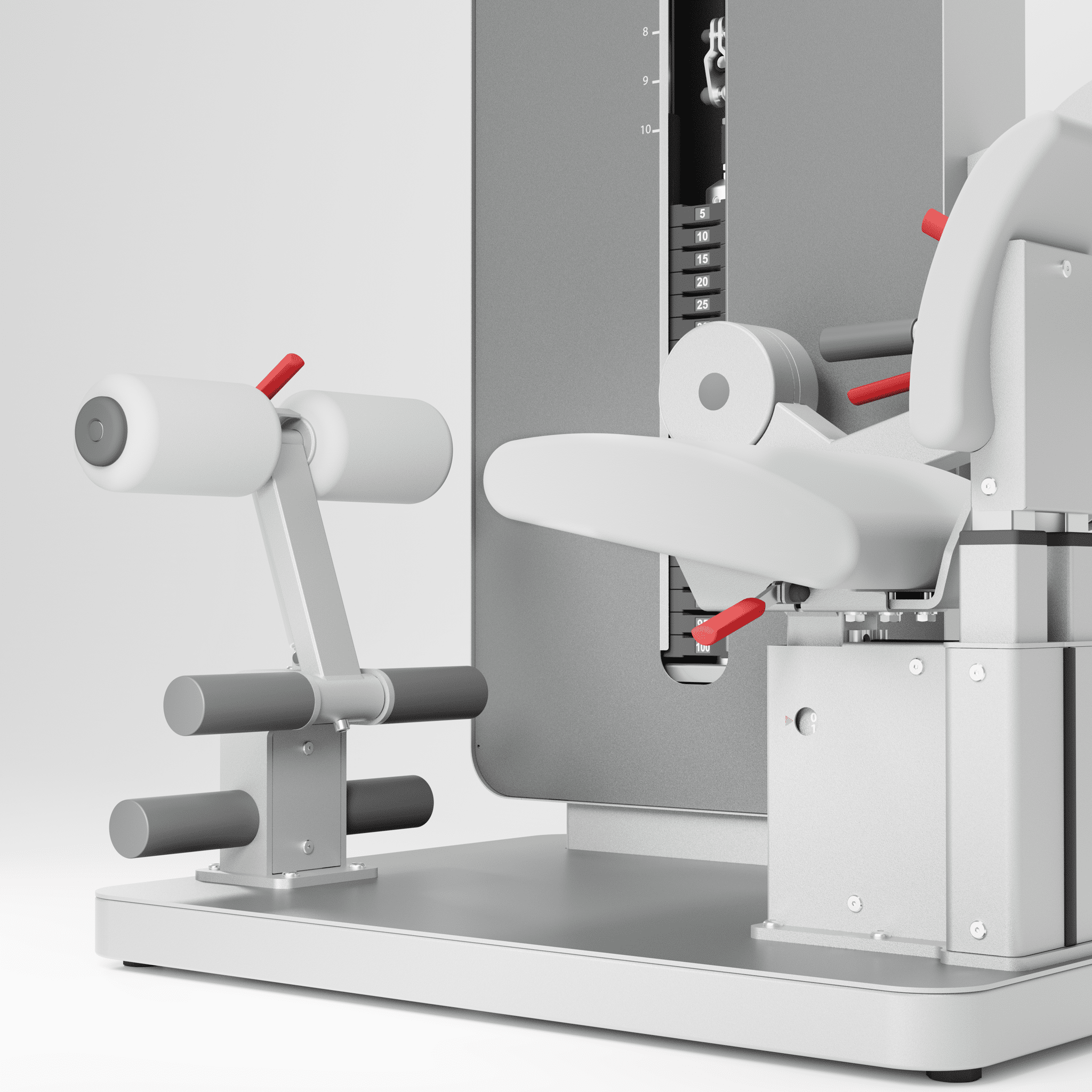 Durch die lordotisch ausgeformte Rückenstütze wird eine stabile Fixierung der Lendenwirbelsäule erzielt. Ergänzend gewährleistet das integrierte Kniepolster beim Training der Rückenextensoren eine biomechanisch korrekte Bewegungsführung und Lastverteilung.