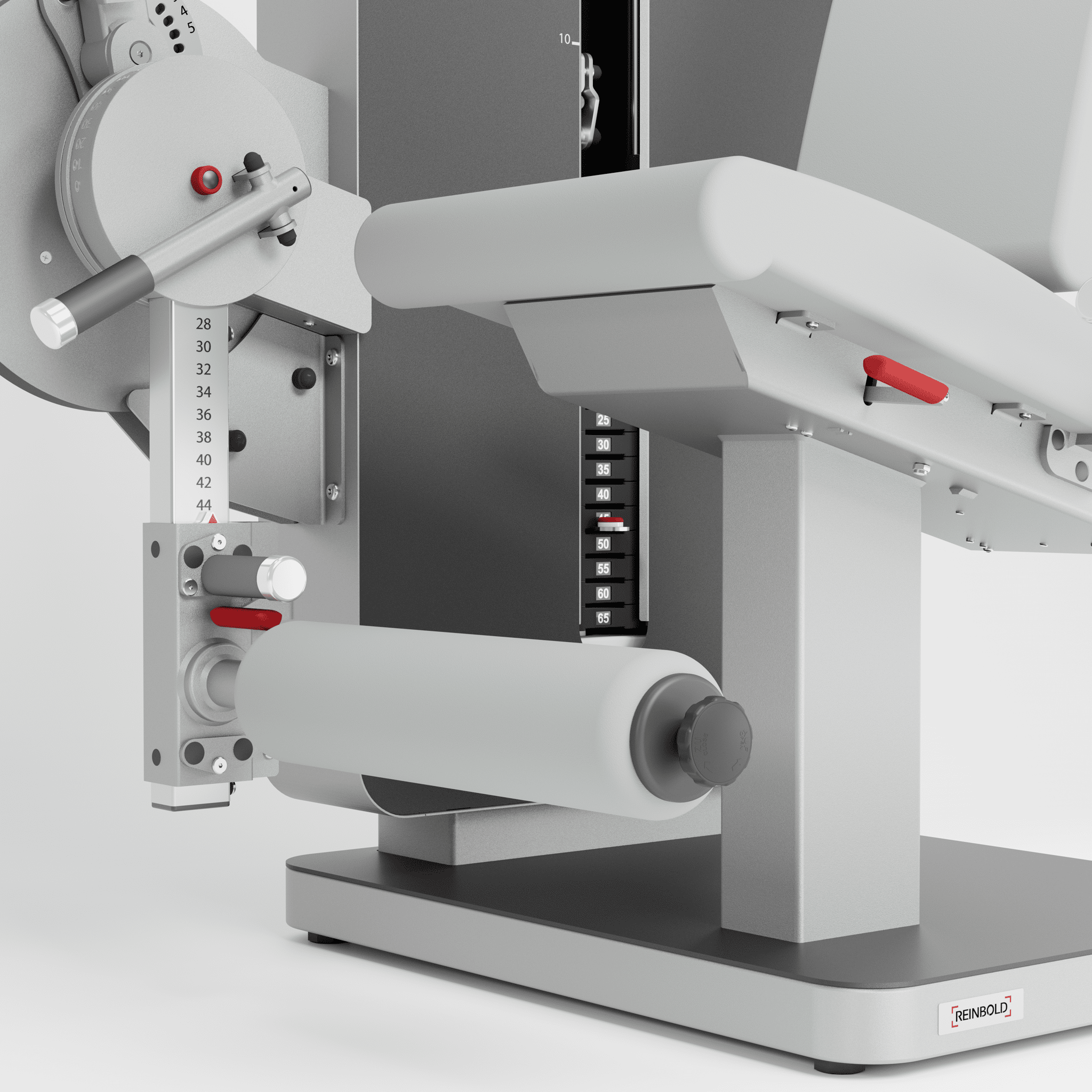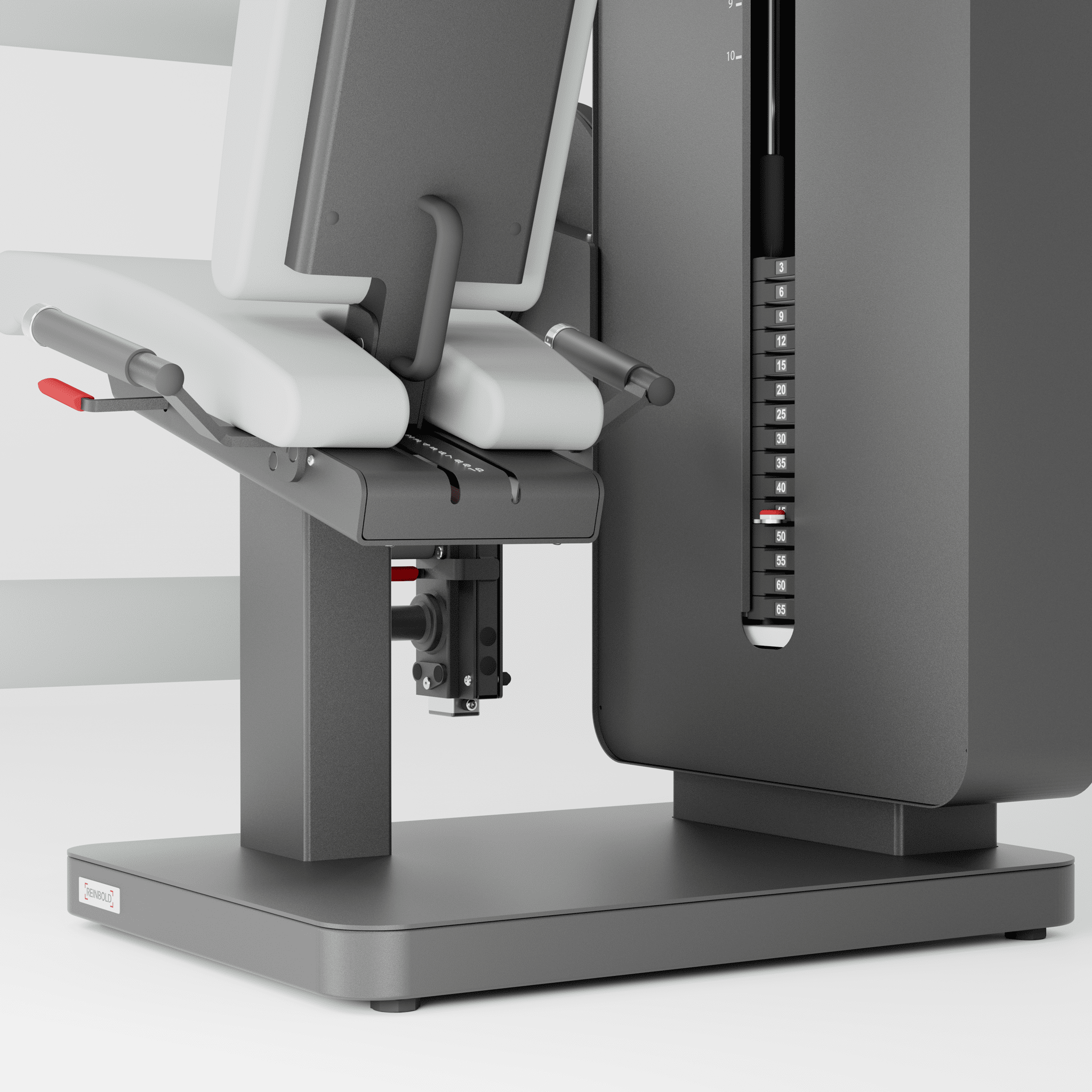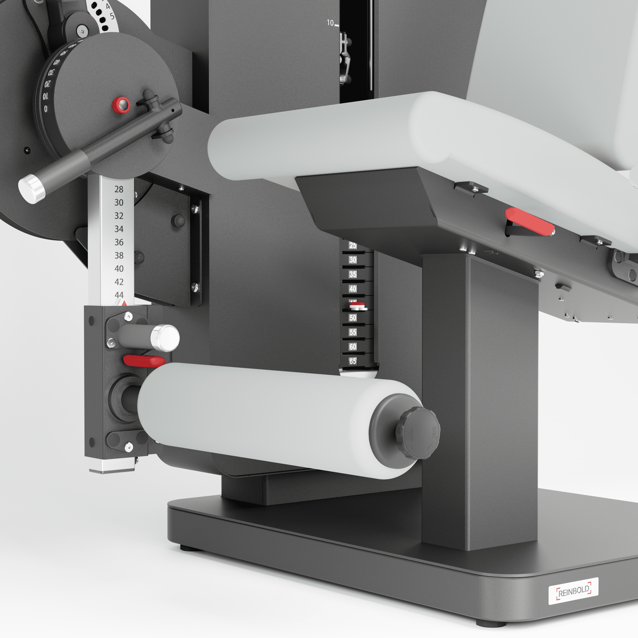 Zur Vermeidung einer Überlastung der Kniebänder ist das Gerät mit einer individuell anpassbaren Andruckrolle ausgestattet, die durch die Fixierung der Kniegelenkachse eine optimale biomechanische Ausrichtung gewährleistet.