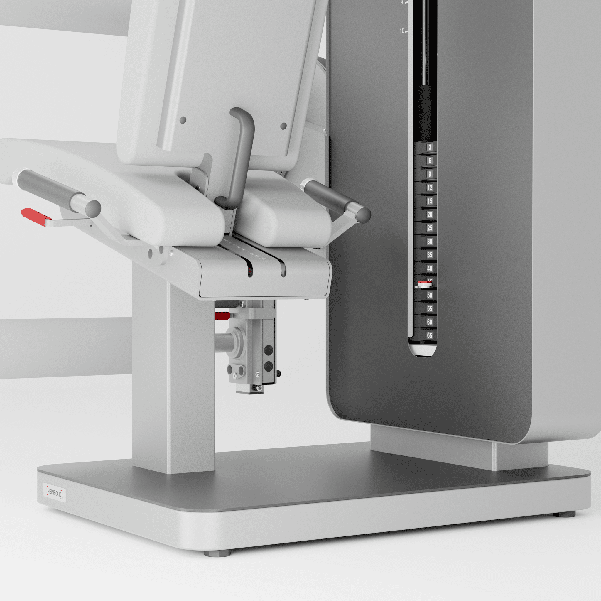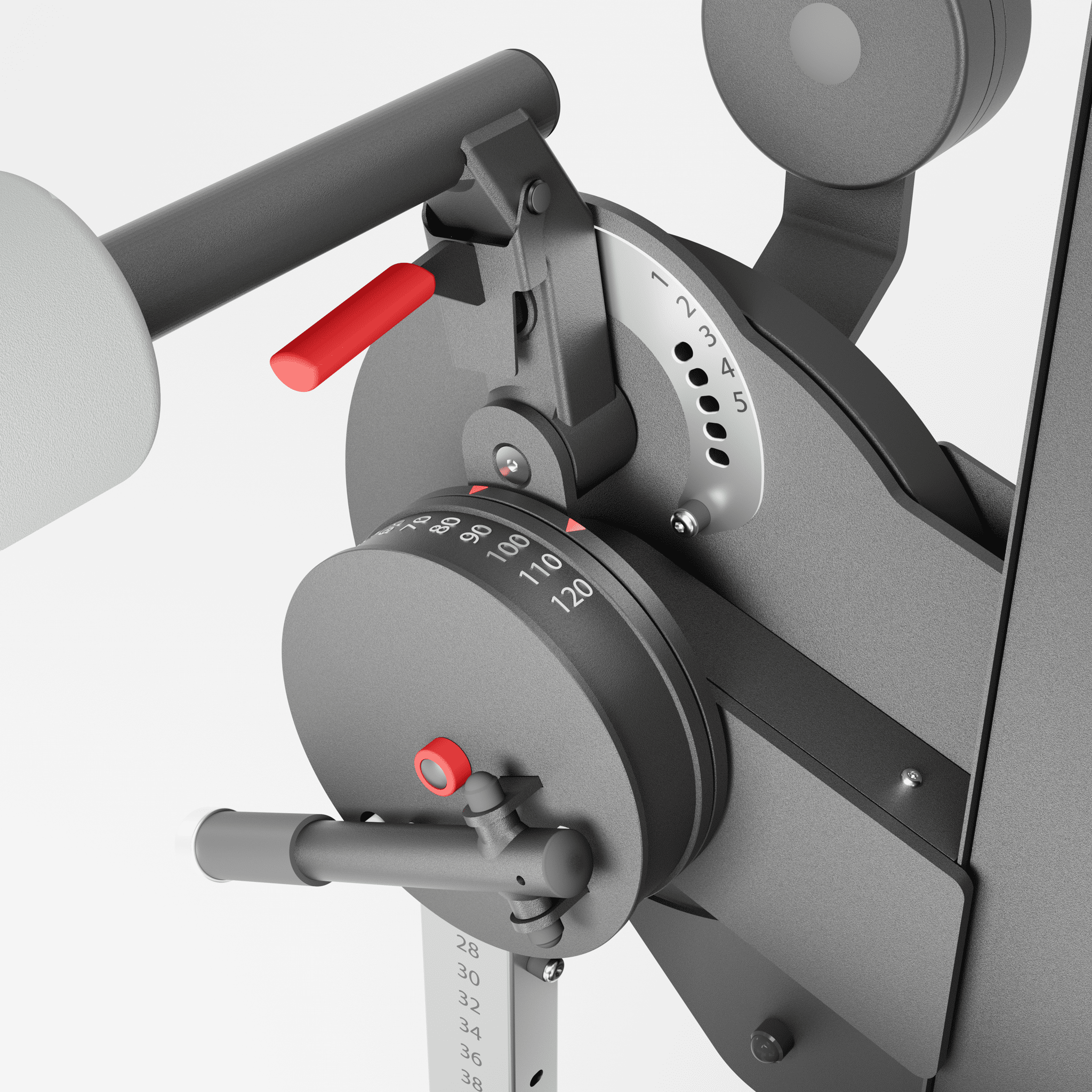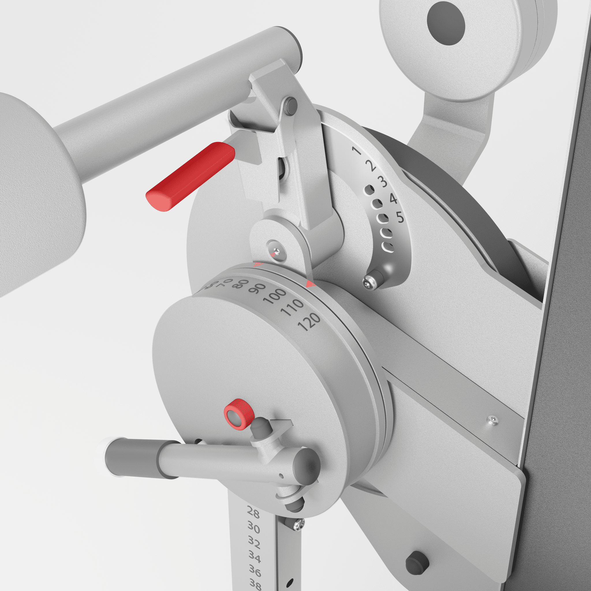 Zur Vermeidung einer Überlastung der Kniebänder ist das Gerät mit einer individuell anpassbaren Andruckrolle ausgestattet, die durch die Fixierung der Kniegelenkachse eine optimale biomechanische Ausrichtung gewährleistet.