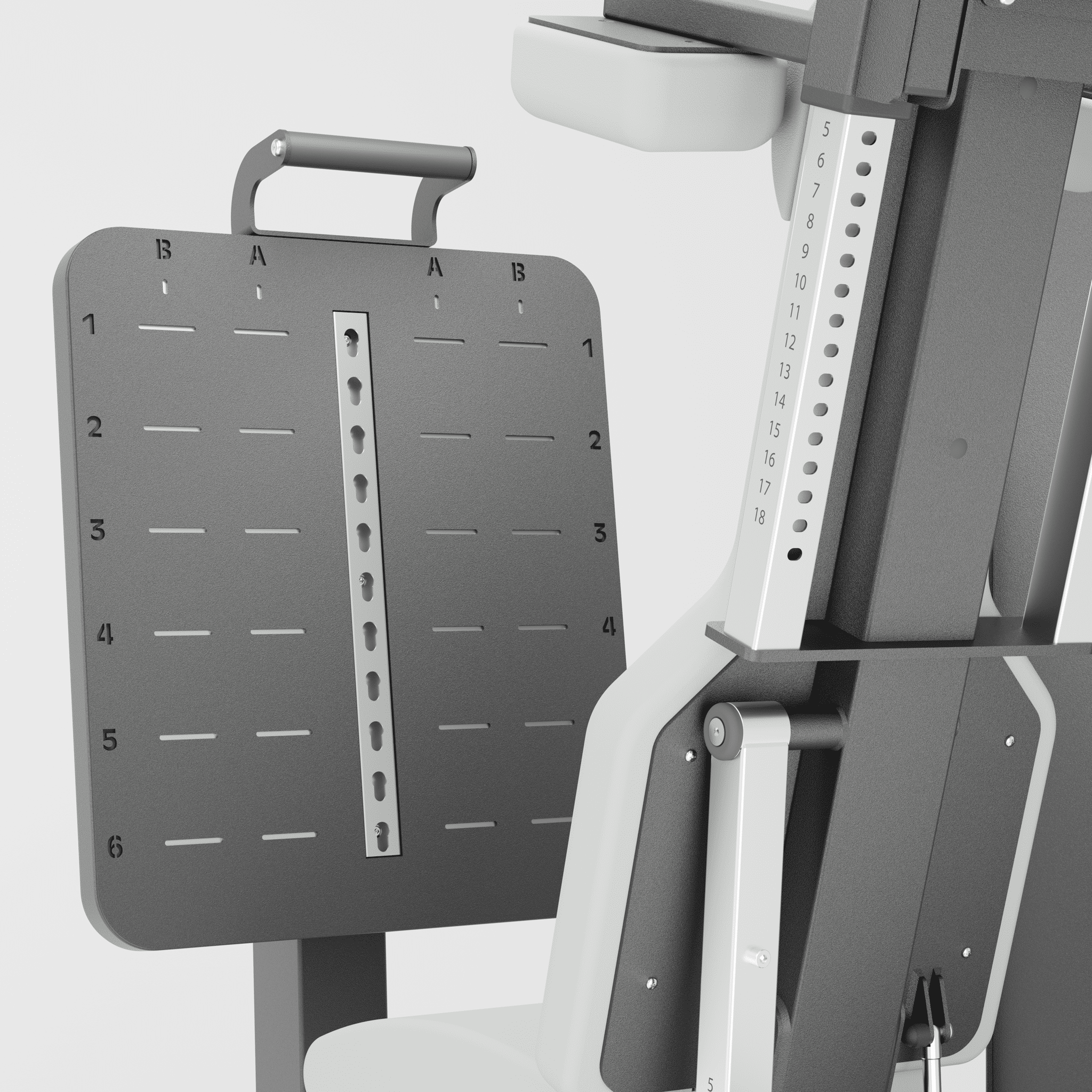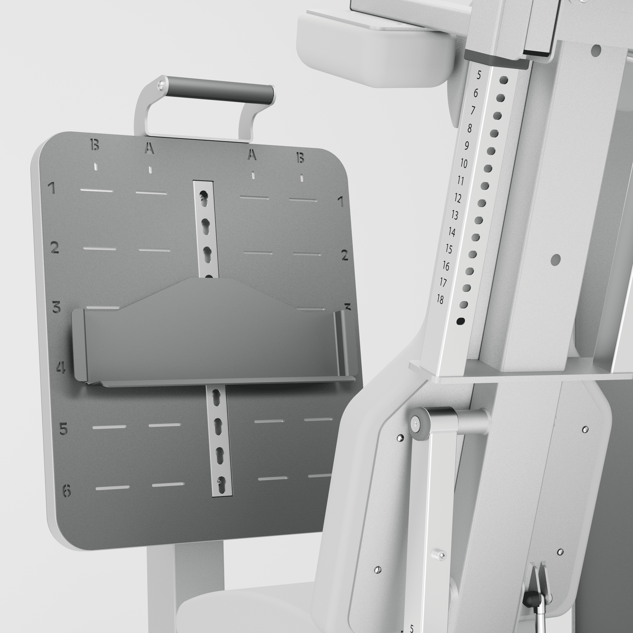 Ein integriertes Koordinatensystem an der Fußplatte unterstützt die exakte Positionierung und Reproduzierbarkeit der Übungsausführung.